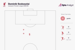 索博斯洛伊本赛季在英超联赛中已经直接通过任意球打入四球。此前,贝克汉姆(2000-01赛季)和劳伦特·罗伯特(2001-02赛季)在一个英超赛季中通过任意球打入五球。