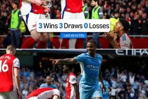 在过去6次对阵曼城的比赛中,阿森纳取得3胜3平保持不败,值得一提的是,在这6场比赛之前的16场比赛中,阿森纳对阵曼城仅取得1胜15负的糟糕战绩。