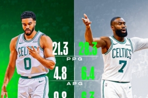 期间,杰伦·布朗场均数据28.3分6.3篮板6.4助攻,投篮命中率45.5%,三分32.2%。