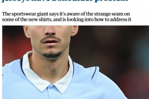 耐克在给《卫报》的一份声明中承认了球衣肩部设计问题,并表示正在研究可能的解决方案:“在最近的国际比赛期间,我们注意到我们的国家队球衣在肩缝处存在一个小问题。虽然不影响球衣性能,但整体外观没有达到应有的标准。”