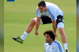 马塞洛晒出与C罗在皇马效力期间的合照,内容为C罗从马塞洛的头上跳过,马塞洛一脸惊讶。